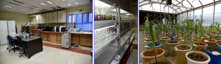 Maize Physiology Lab is well equipped with state-of-art facilities (rain-out-shelter, micro-plots, net house, etc.) along with equipment like portable photosynthesis system (LICOR 6400), UV-visible spectrophotometer, refrigerated centrifuge, SPAD chlorophyll meter, root capacitance meter, Dew Point micro-volt meter, green seeker optical sensor, water and soil analysis kit, rotating water bath, precision electronic balance, pH meter, conductivity meter, infrared thermometer, etc.