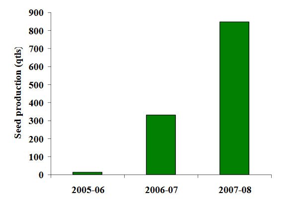 Owing to the cob size, yield potentiality and quality of kernels (both as food and feed) the farmers spontaneously adopted the hybrid for their maize cultivation and seed material was made available to them. As a matter of fact, the QPM gained immense popularity among the cultivators that resulted in high demand of seed very rapidly. To meet the increasing demand of seed, hybrid seed production programme was taken up in farmers’ field. Some Private Seed Companies and Govt. Undertaking Organizations were also brought under seed production channel. Selected farmers and the personnels of seed growing organizations were trained up on maize hybrid seed production technology with the guidance from Directorate of Maize Research, Indian Council of Agricultural Research, New Delhi. The trained farmers, Govt. Undertaking Organizations and Private Seed Growers took up Seed Production of HQPM-1 under certification programme and produced following quantities of certified seeds. The progress of QPM seed production has been depicted in figure 1.