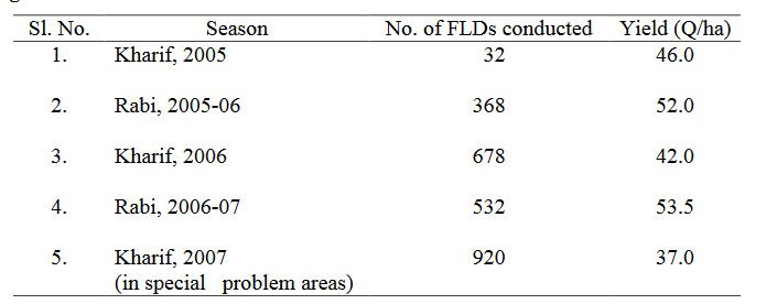 QUALITY PROTEIN MAIZE: A SUCCESS STORY IN WEST BENGAL In West Bengal, requirement of maize grain for poultry industry alone is about 2100 tones/day and to satisfy this demand, more than 2.5 lakh hectare is to be brought out under quality protein maize considering average productivity of 30 qtls/ha. Considering the importance of quality protein maize for poultry sector in West Bengal, CIMMYT-India took initiative during 2004-05 to introduce QPM (HQPM-1) in West Bengal in collaboration with State Department of Agriculture, West Bengal and thereafter systematic Research & Developmental work on maize has been started. The QPM hybrid (HQPM-1) was first evaluated in Adaptive trial in all the agro-climatic zones of the state except the Coastal-Saline areas and performance of the hybrid was found to be excellent in every locations and average yield of 70.0 q/ha was recorded. During 2007-08, total area under maize was about 1.0 lakh ha having production of about 30.0 lakh tones. Owing to satisfactory performance and wide adaptability, it was decided to popularize the hybrid across the state through demonstrations. Programme of conducting FLD in different seasons was started since Kharif, 2005 and continued upto Kharif, 2007 the results of which are appended below: